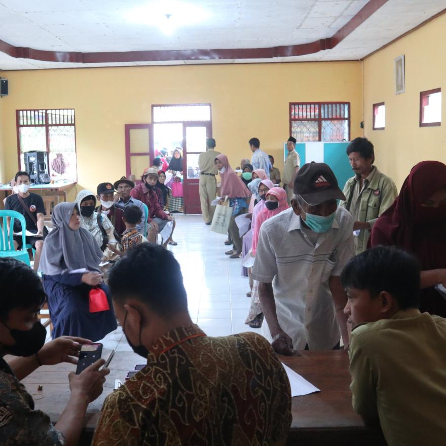 Pembagian bantuan sosial berupa bantuan PKH, BBM dan BPNT oleh petugas dari kantor pos dilaksanakan di Balai Desa Gintungreja.