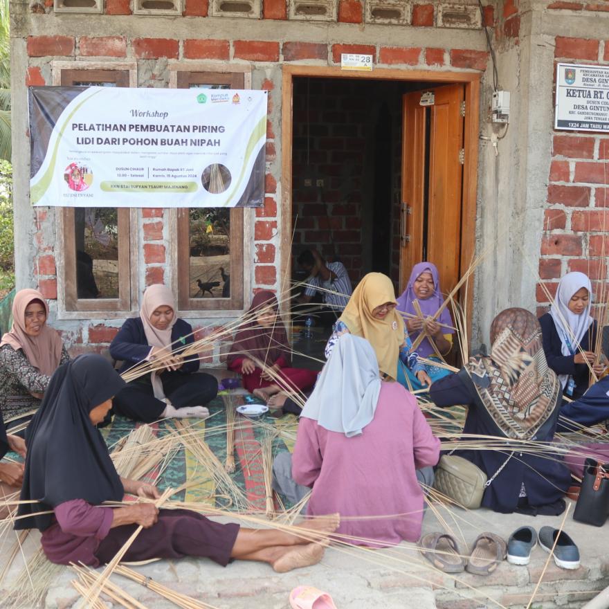 Tingkatkan produktifitas sejumlah ibu rumah tangga ikuti pelatihan kerajinan tangan berupa piring berbahan baku lidi Nipah, pada Kamis, 15 Agustus 2024, di dusun Cihaur, desa Gintungreja.