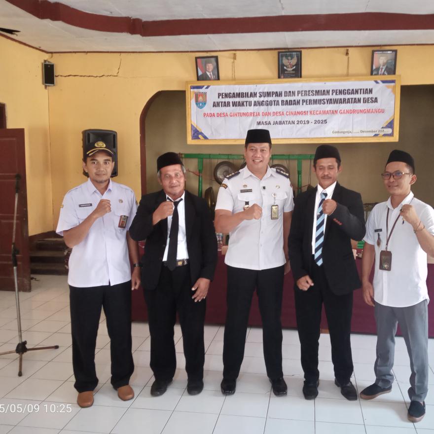 Diakhir acara camat Gandrungmangu secara simbolis menyerahkan SK serta dilanjutkanpemberian ucapan selamat selain itu juga sejumlah tamu undangan memberikan ucapan selamat kepada kedua BPD terlantik baik BPD Desa Gintungreja maupun BPD Desa Cinangsi.